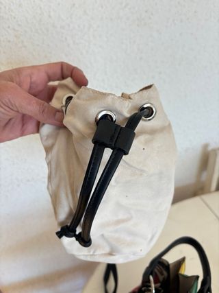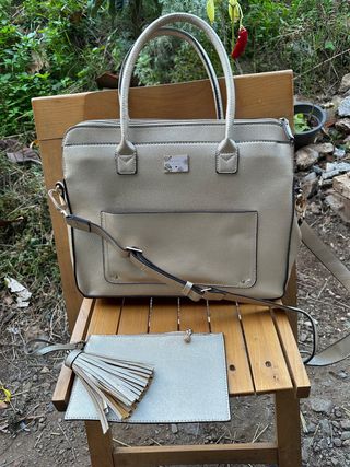 Elegante bolso de la marca Parfois. - Color beige y dorado. - Incluye un neceser a juego con borla. - Asa de mano y correa para hombro.