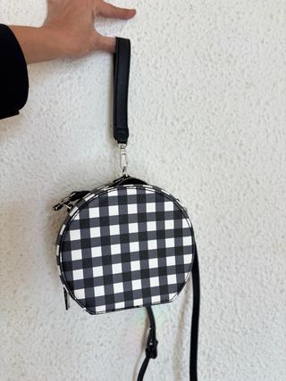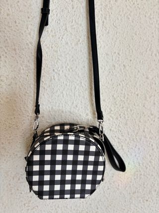 Bolso bandolera Parfois de forma redonda con un diseño de cuadros. - Cierre de cremallera. - Correa ajustable. - Asa de mano.