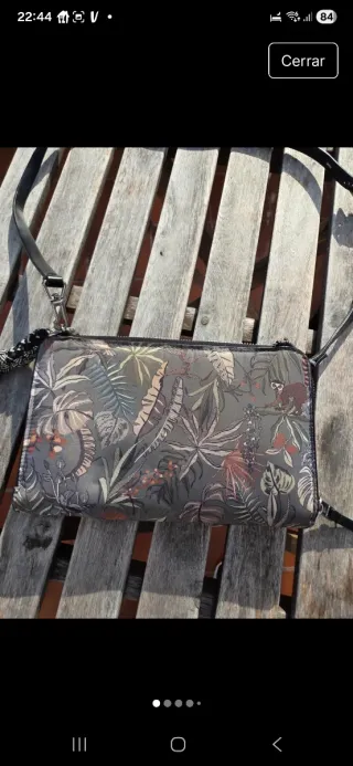 Bolso de tamaño medio, y forma rectangular. Con 2 compartimientos principales, 1 de cremallera y otro con boton imantado, y varios compartimientos en el interior. Con tira para llevar de bandolera. Color verde y estampado tipo jungla. Artículo usado un par de veces, como nuevo. Marca: Parfois. Medidas: 24cm x 16cm (H2643)