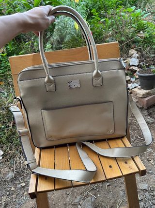Bolso de mano y hombro de la marca Parfois. - Diseño elegante en tono beige. - Detalles metálicos en dorado. - Asa corta y correa larga ajustable.