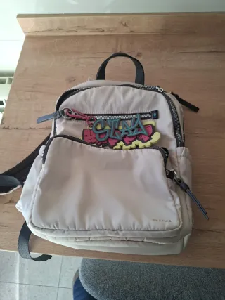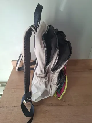 Mochila de la marca Parfois 30 cm x 25cm vacia de color beige, con un detalle de charm.