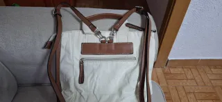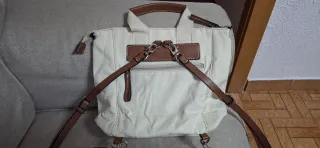 Bolso versátil que se puede usar como mochila o bolso de mano. - Material exterior de lona. - Detalles y asas en piel sintética marrón. - Cierre de cremallera principal. - Bolsillo exterior con cremallera. - Correas de mochila ajustables.