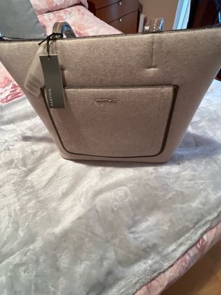 Bolso grande de la marca Parfois en tonos beige y gris. Tiene un bolsillo exterior. - Material exterior de fieltro. - Detalle de bolsillo frontal. - Cierre de cremallera superior.