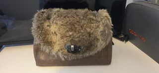 Bolso de mano con un diseño moderno y llamativo. - Acabado en piel sintética. - Detalle de pelo sintético en la solapa. - Cierre metálico de clip.