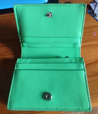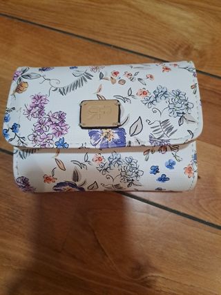 Cartera parfois. Tipo cartera de mano, con pequeña correa. Dos compartimentos para dinero y múltiples espacios para tarjetero. No se ha usado pero tiene en su parte interna unas pequeñas zonas rozadas, se aportan fotos. Billetero. Monedero.