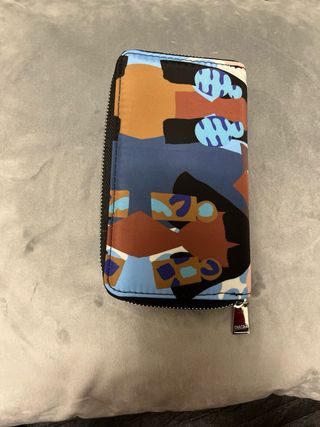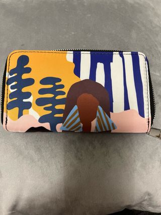 Cartera monedero con un diseño artístico y vibrante. Sus dimensiones son 17x10 cm. - Estampado abstracto con figuras y líneas. - Cierre de cremallera. - Interior espacioso para organizar tus pertenencias.