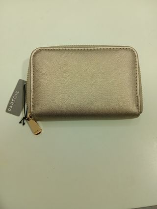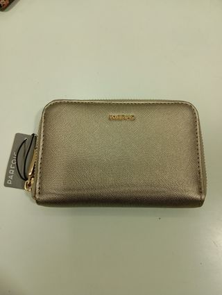 Elegante cartera de la marca Parfois. - Color dorado. - Cierre de cremallera. -Ranura para tarjetas y billetes. -Compartimento para moneeas. -Medidas 14 x 9 x 2 cm.