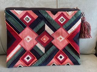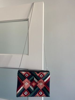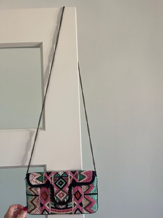 Cartera de mano con bolitas multicolor. Tiene cadena para colgar.marca parfois