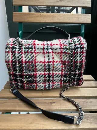 Bolso de Parfois con un diseño de cuadros llamativo. - Tejido de tweed con hilos de colores. - Asa superior y correa de cadena. - Cierre de solapa.