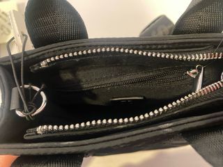 Bolso color negro con detalle tipo cebra. Dispone de varios departamentos: tanto en la parte delante como trasera hay un bolsillo con cierre de imán y luego en el interior, hay más bolsillos, todo ello se cierra con cremallera. La cinta del hombro se puede regular. Llavero firma de regalo incluido.