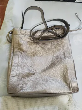 Bolso de mano o al hombro con un llamativo acabado metalizado. - Diseño moderno y versátil. - Cierre de cordón. - Asa larga ajustable.