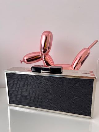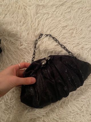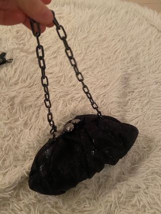 Clutch negro de piel sintética y remates metálicos plateados. Uno de los lados está un poco cedido porque la piel se ha despegado (ver imágenes). No impide su uso y se puede arreglar. El interior es de tela con un pequeño bolsillo. Cuenta con una cadena plateada para colgar que tiene la posibilidad de ponerse y quitarse. Medidas: 20cm x 8,5cm x 3,5cm El uso que se le ha dado es en una ocasión para una boda. Comprado en Parfois por 23,99€ 300 gr
