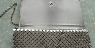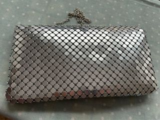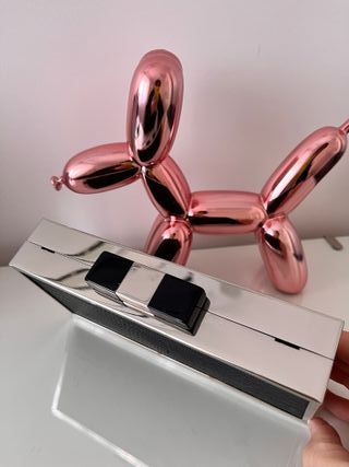 Elegante bolso de mano con un diseño metalizado en plateado, perfecto para eventos especiales. - Acabado brillante. - Cadena metálica para llevar al hombro.