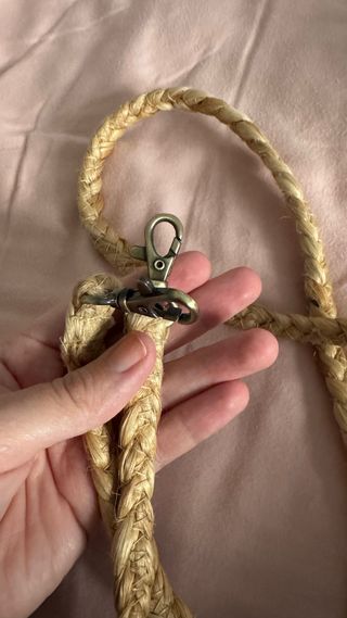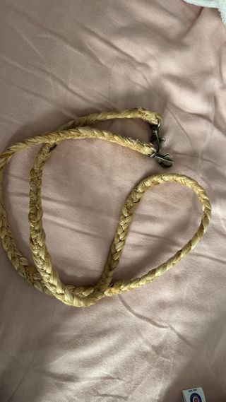 Correa de cuerda trenzada con un acabado natural y un mosquetón metálico. - Material de cuerda resistente. - Mosquetón de color dorado envejecido. - Ideal para bolsos.