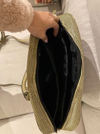 Bolso de trabajo con un diseño elegante y llamativo. - Acabado texturizado con hilos dorados. - Asa corta para llevar en mano. - Correa larga ajustable para hombro. - Bolsillo frontal con cremallera.