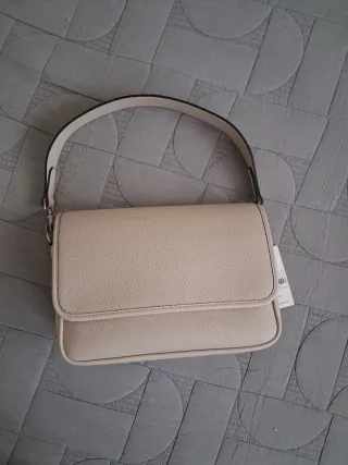 Bolso de mano y hombro de la marca Parfois. - Diseño elegante en tono beige y gris. - Asa corta para llevar en mano. - Correa larga ajustable para el hombro.