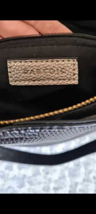Bolso de mano de cuero auténtico con un diseño moderno. - Material exterior: cuero. - Detalle superior con acabado de cocodrilo. - Estampado de puntos en el cuerpo principal. - Asa de mano y correa desmontable. Entrega en mano disponible a diario en el Barrio de Butarque, en Villaverde Bajo, en la esquina del Burger King, o bien Lunes y Miércoles en Estación de Sol de 14.45am a 15.00am. Envío Wallapop disponible.