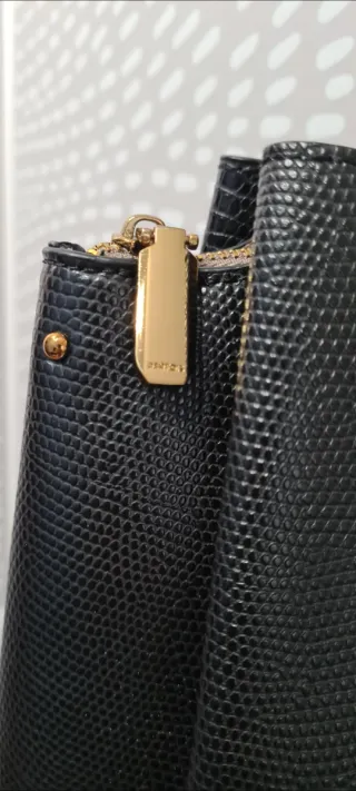 Elegante bolso negro de Parfois con un diseño texturizado que imita la piel de serpiente. - Acabado brillante. - Cadena dorada. - Cierre de cremallera.