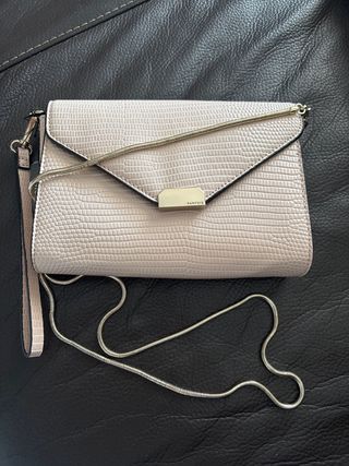 Elegante bolso cartera en color beige, perfecto para complementar tu estilo. - Diseño tipo sobre. - Asa larga ajustable y asa corta - Detalle metálico frontal.