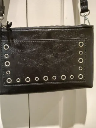 Bolso pequeño tipo bandolera con un diseño moderno. - Acabado en piel sintética. - Detalle de remaches metálicos. - Cierre de cremalleras. - 3 compartimentos, 2 de ellos con cremallera, mas un bolsillo delantero. - Correa ajustable de largo. - 30cm de ancho, 24cm de alto y 5cm de fondo.