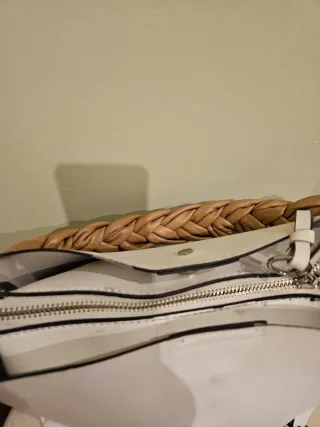 Bolso de mano y hombro de la marca Parfois. - Asa superior trenzada en color marrón. - Cuerpo principal en color blanco. - Cierre con botón a presión. - Incluye correa larga ajustable.