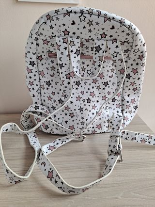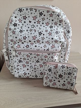 Vendo mochila estampada con bolsillos con cremallera en la parte delantera y trasera. Bolsillos laterales. Cierre principal de solapa con imán. Asas posteriores fijas y ajustables. Asas de mano fija