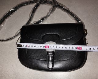 22 centimetros de largo 12 de alto 10 de ancho Con varios tipos de tela y colores. Mayormente en tono marron. Asa de 50 a 60 centímetros de largo. Casi nuevo.
