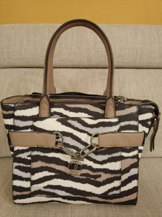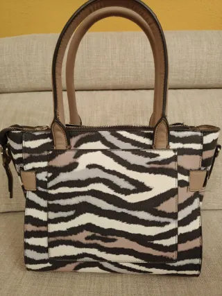 Bolso de mano con un llamativo estampado de cebra en tonos beige, negro, gris y blanco. Cuenta con asas superiores y un cierre de cremallera. - Diseño con estampado de cebra. - Cierre principal de cremallera. - Asas superiores para llevar en la mano o al hombro.