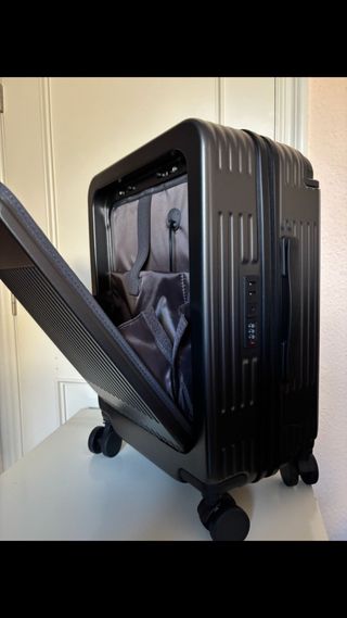 Maleta con textura rígida. Cierre combinación fijo. Asa extensible con seguro. Bolsillos interiores con cremallera y rejilla. 4 ruedas. Puerto USB interno para conectar un power bank al cable ubicado en el compartimento delantero. Dispone de dos puertos (usb y tipo c) para cargar dispositivos electrónicos. Compartimento delantero con cierre de combinación. Portavasos parte trasera. Marca parfois Color gris oscuro Dimensiones cm: 37,5 x 55x 24