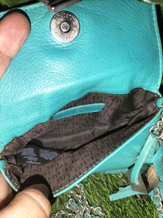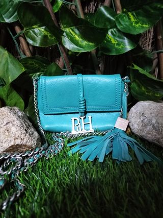 Pochette de cuero turquesa Pedro del Hierro sin usar, descatalogado y nuevo. Asa melatica con entrecruzado de cuero turquesa.
