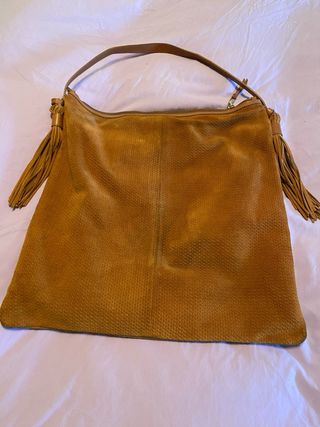 Bolso de ante con un diseño de flecos muy llamativo. - Material: Piel vuelta. - Adorno de flecos. - Cierre de cremallera. No lleva etiqueta pero no se ha usado nunca.