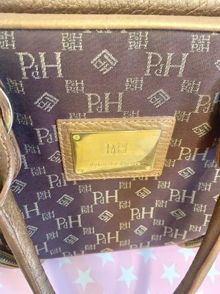 Elegante bolso de mano con el distintivo estampado de la marca. - Diseño con monograma PDH. - Placa metálica dorada con el logo. - Cierre de cremallera. - Ribetes y asa en piel marrón.