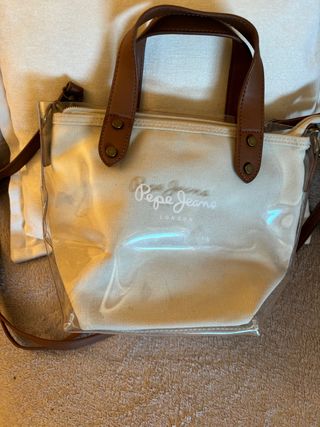 Bolso de mano y bandolera de Pepe Jeans. - Material exterior transparente. - Interior de tela color beige. - Asas y detalles en piel marrón.