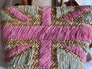Bolso de rafia con dibujo de bandera Union Jack en rosa y gris. Parte de atrás la marca en color rosa . Posibilidad de llevar de mano o colgado del hombro. Forro con cordón para cerrarlo y bolsillo interior con cremallera . Medidas 45 x 25 x 11 cm. En muy buen estado.