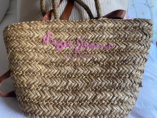 Bolso de rafia, de gran capacidad, 49 x 35 cm. Esta sin extremar. Por dentro tiene bolsillos y luego va atado, con cuerda que se ajusta.