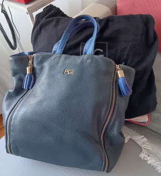 Bolso de piel de la marca Purificación García en color azul marino. Un accesorio elegante y espacioso. - Detalle de cremalleras laterales. - Dos asas de mano. - Logo metálico de la marca en la parte frontal. - Adornos de flecos en las cremalleras.
