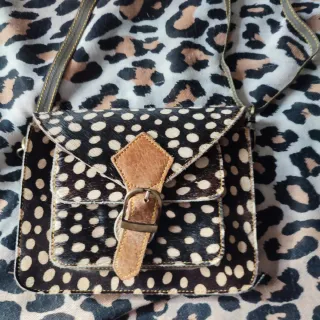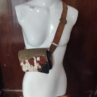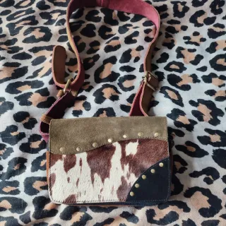 Bolso artesanal con un diseño único y llamativo de piel de potro.Usado en un par de ocasiones, vale de riñonera y de bolso, comprado en tienda de regalos en Madrid. - Elaborado en piel. - Combinación de texturas y colores. - Adornado con tachuelas metálicas.