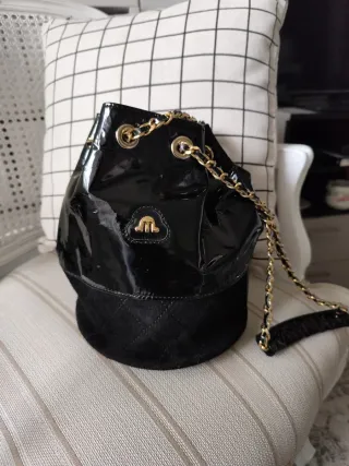 Elegante bolso de mano con un diseño moderno y sofisticado. Altura 23 diámetro 19 - Material exterior de charol brillante. Elegante - Detalle acolchado en la base. - Cadena dorada para llevar al hombro o cruzado. - Cierre de cordón ajustable. Entrega en Avda de Pío XII.