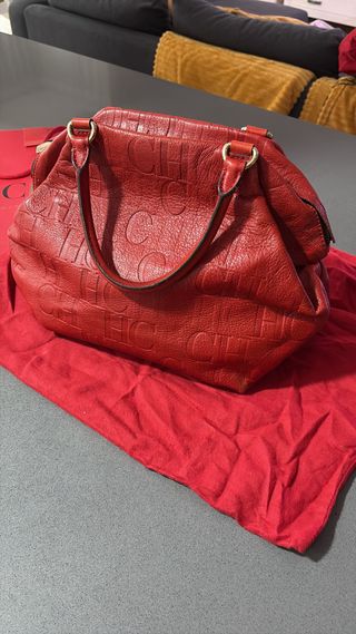 Elegante bolso vintage de Carolina Herrera. En perfectas condiciones en piel rojo. - Diseño con monograma CH grabado. - Asas superiores. - Incluye bolsa guardapolvo.