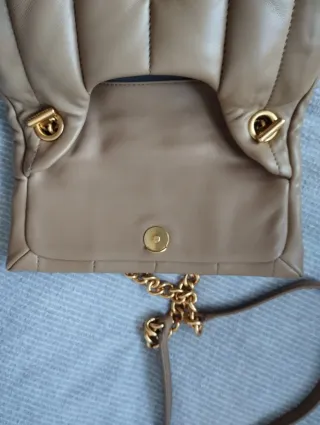 Bolso de piel con un diseño acolchado y detalles dorados. El desgaste se aprecia mas en la foto de lo que se puede ver si lo llevas puesto . - Material: Piel - Color: Beige - Acabado metálico: Dorado