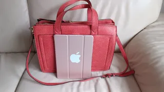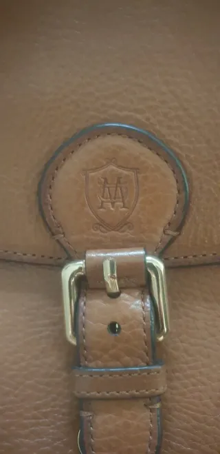 Bolso marrón con cuatro bolsillos interiores y herrajes en el exterior, mide 37×20 cm.