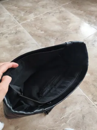 Bolso de piel en color negro. - Diseño moderno y funcional. - Correa ajustable para mayor comodidad. - un Bolsillo exterior un dos con cremallera para.