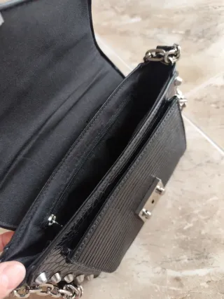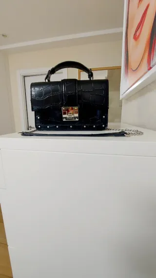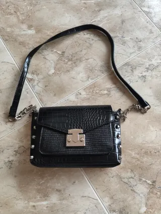 Elegante bolso negro con acabado que imita la piel de cocodrilo. - Cierre metálico. - Detalle de tachuelas plateadas. - Correa ajustable con cadena.