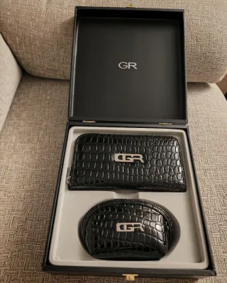 Estuche con un elegante conjunto de cartera y monedero de Georges Rech nuevo (incluye los separadores y el relleno de papel) . - Diseño texturizado tipo piel de cocodrilo en negro. - Acabado brillante. - Logo metálico GR en ambas piezas. Ideal para regalar