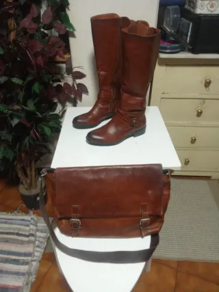 Conjunto de botas altas y bolso de piel. - Botas de caña alta - Bolso tipo mensajero.