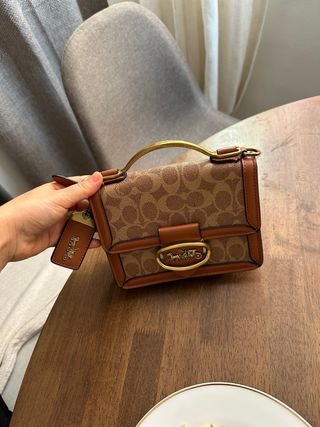 Bolso de mano Coach con estampado clásico. - Diseño con monograma. - Ribetes y detalles en piel marrón. - Cierre con broche metálico. - Asa superior dorada.