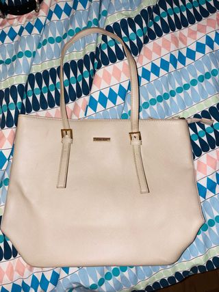 Bolso de mano elegante en color beige. Su diseño es moderno y práctico para el día a día. Precio negociable. - Material: Piel sintética. - Cierre de cremallera superior. - Dos asas de hombro. - Detalle de hebillas doradas.