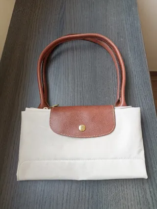 Bolso grande de la marca Longchamp. - Color beige con detalles en marrón. - Asa de piel. - Cierre de solapa con botón dorado y logo original Lo compré hace 1 año en el Corte Inglés y está usado un poco con algunas manchitas pero las costuras y asideras están en perfecto estado. Tiene un bolsillo interior.