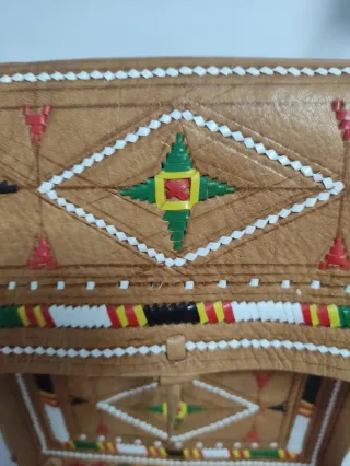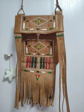 Bolso de piel con un diseño único y llamativo, adornado con flecos y detalles bordados. - Material: Piel - Adornos: Flecos y bordados - Estilo: Artesanal