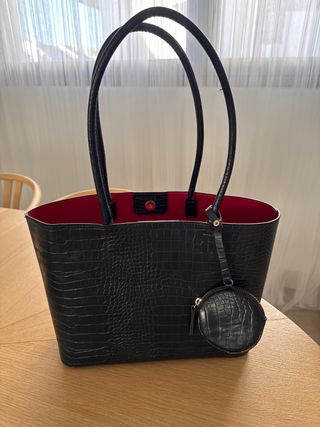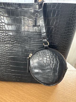 Elegante bolso con acabado que imita la piel de cocodrilo. Incluye un práctico monedero a juego. - Diseño de efecto cocodrilo. - Interior en contraste de color rojo. - Asa de mano. - Monedero colgante con cremallera.